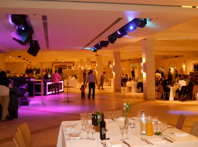 As we entered the ballroom of kibbutz Ramat Rachel, there were greeters on stilts handing out roses to everyone. This led into a cocktail hour with an assortment of hors d'oeuvres ranging from tacos to little cups of soup. When this part of the evening ended, everyone made their way to tables around a huge dance floor. At every seat were ceramic chamsas to take home and programs detailing the night's activities. After a few short speeches, the first course was served and, perhaps more importantly, the main bar opened up for the night. Shortly after, there was a fire twirling show and a mini-concert put on by singer Din Din Aviv of the Idan Raichel Project. At one point, Aviv started singing Hava Nagila and almost every single Rothberg student participated in a giant hora! This was proceeded by the main course--turkey and brisket--and an evening of dancing.